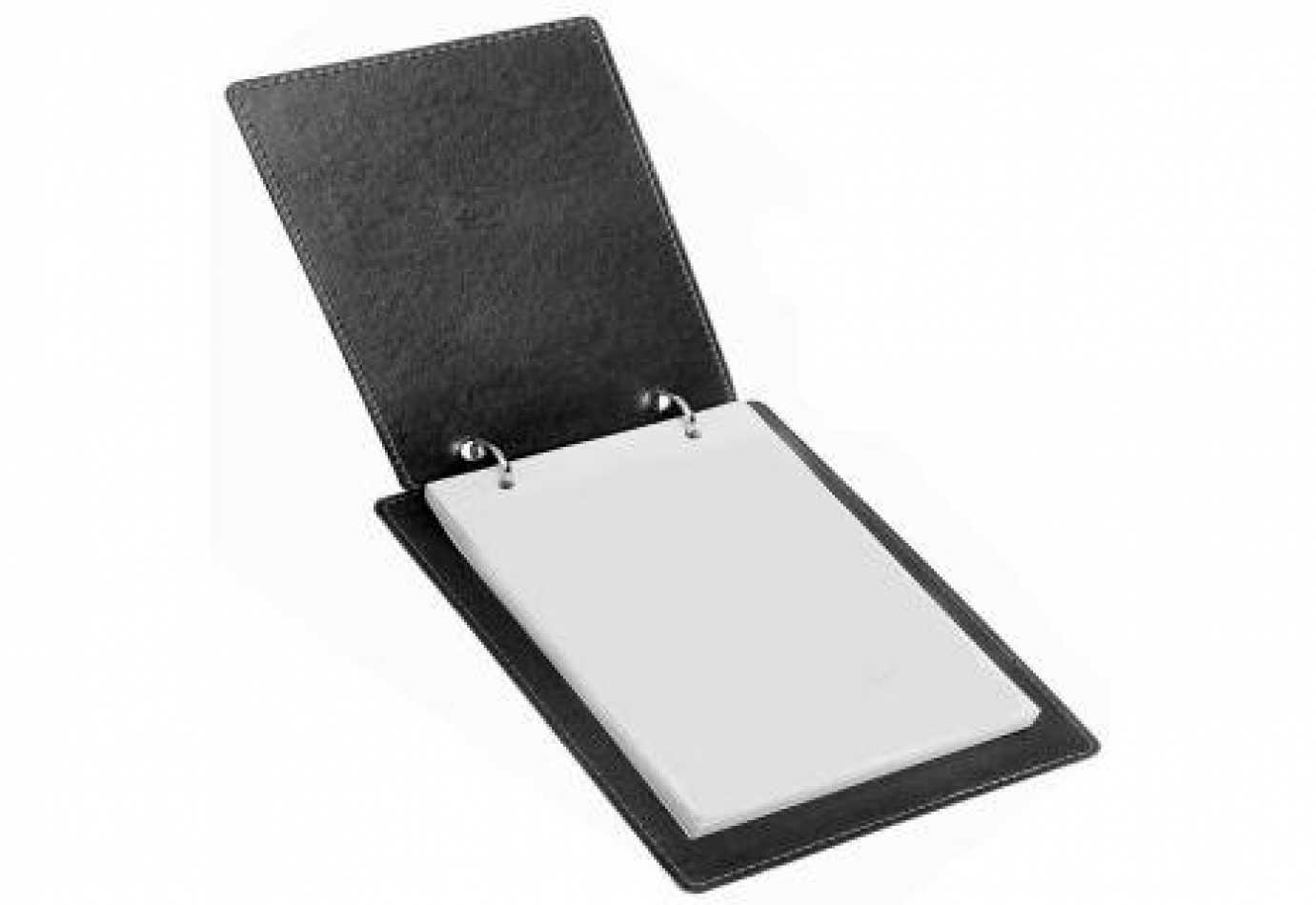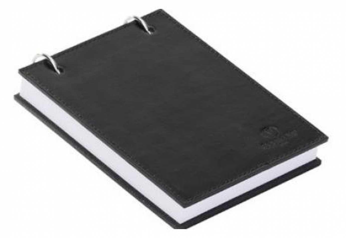 Bloco de anotação de mesa com trilho de ferro, material couro sintético. Possui suporte na lateral interna para colocar caneta(não acompanha) e aproximadamente 200 folhas sem pauta.