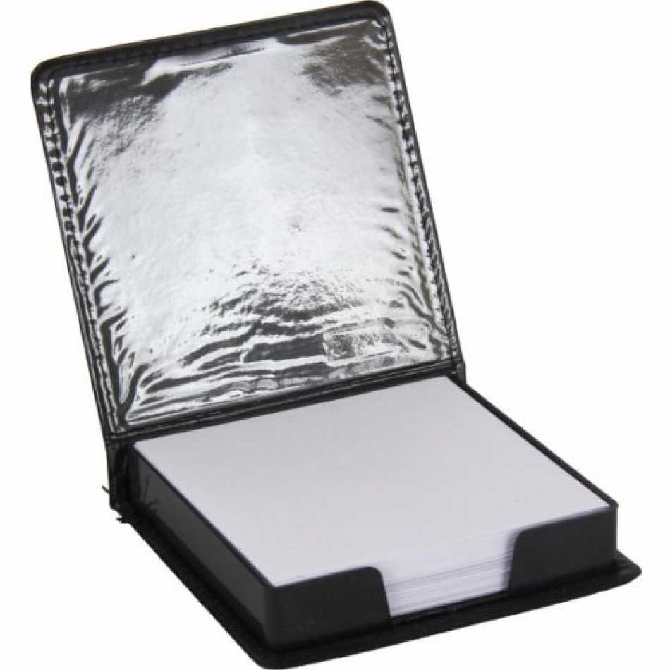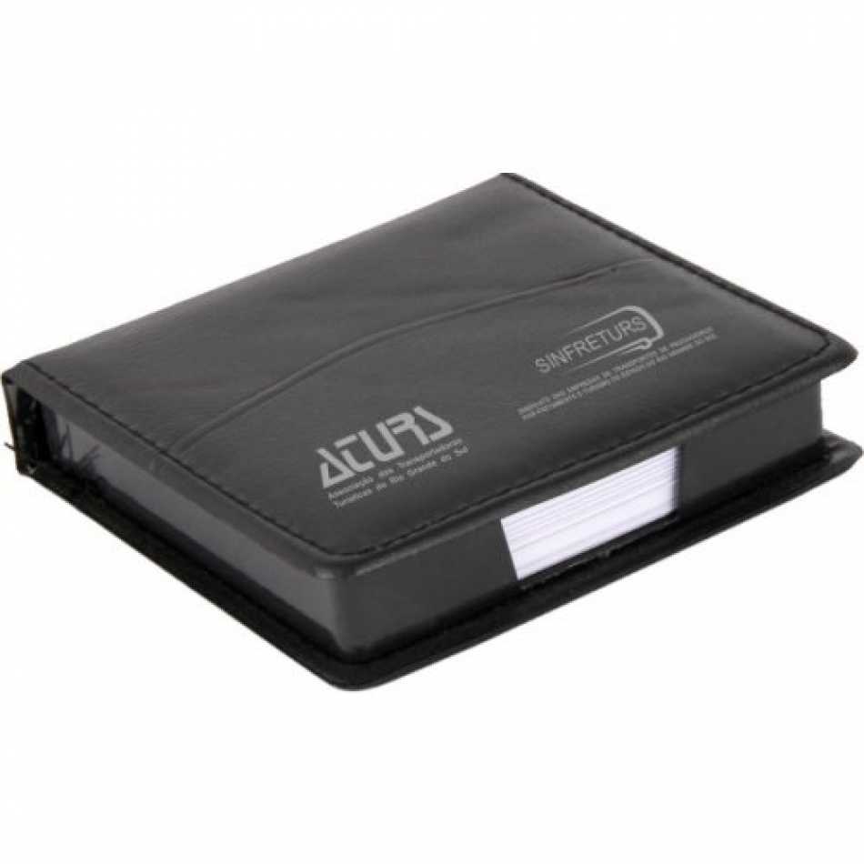 Bloco de anotações de couro sintético com detalhe na capa, parte interna com bolso plástico e bloco de folhas brancas com aproximadamente 145 folhas.