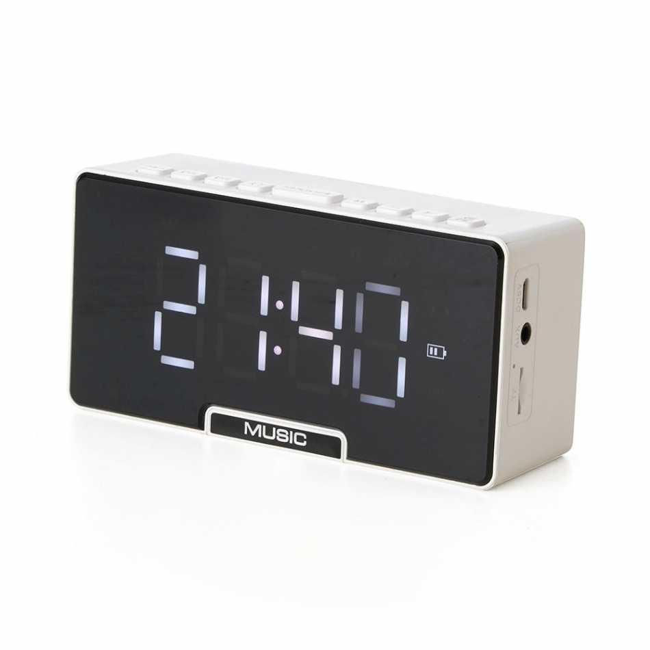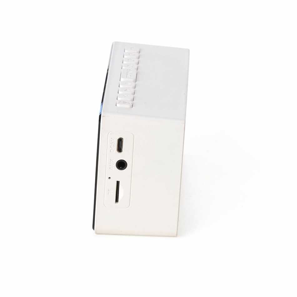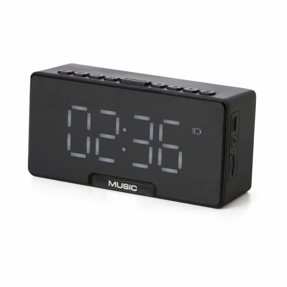 Caixa de som multimídia com relógio despertador e suporte para celular. Produzida em plástico e com borrachas antiderrapantes na área inferior, a caixa de som tem a área frontal com display de LED, além de um compartimento com suporte para celular – uma espécie de “gaveta” aonde é exibido (MUSIC), basta puxá-la ter acesso ao compartimento. A caixa de som executa nos modos bluetooth, rádio FM, cartão TF-microSD e entrada auxiliar P2. Acompanha cabo USB e manual em inglês.