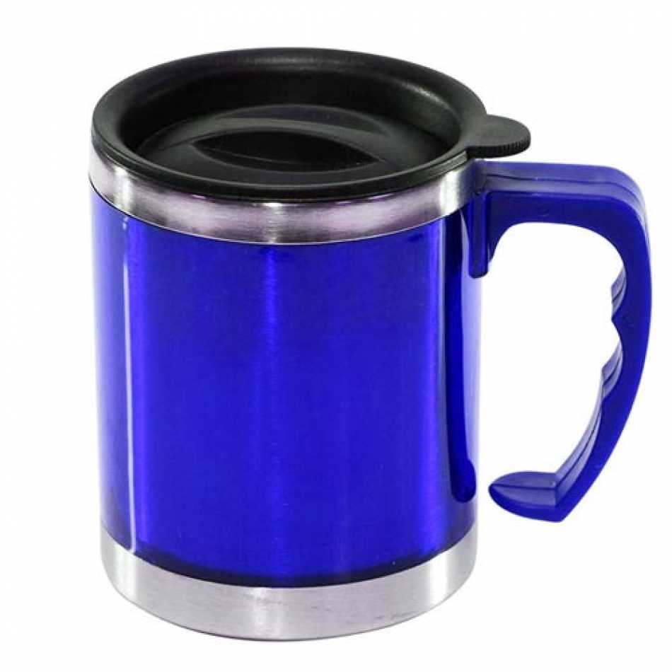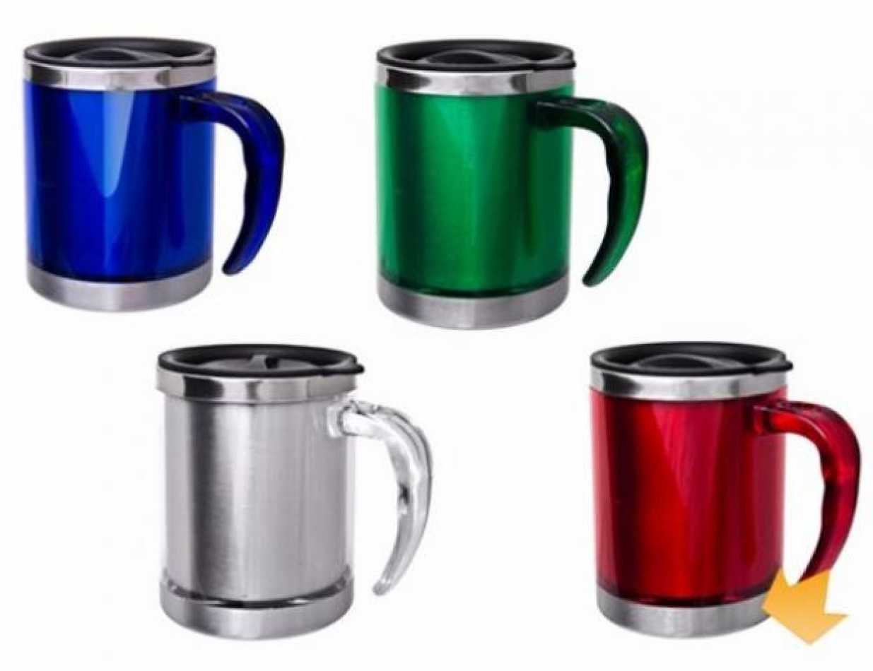 Caneca acrílica 400ml com detalhe oval no pegador, revestimento interno e detalhes em inox. Tampa plástica resistente com sistema giratório para abertura(não é térmica).