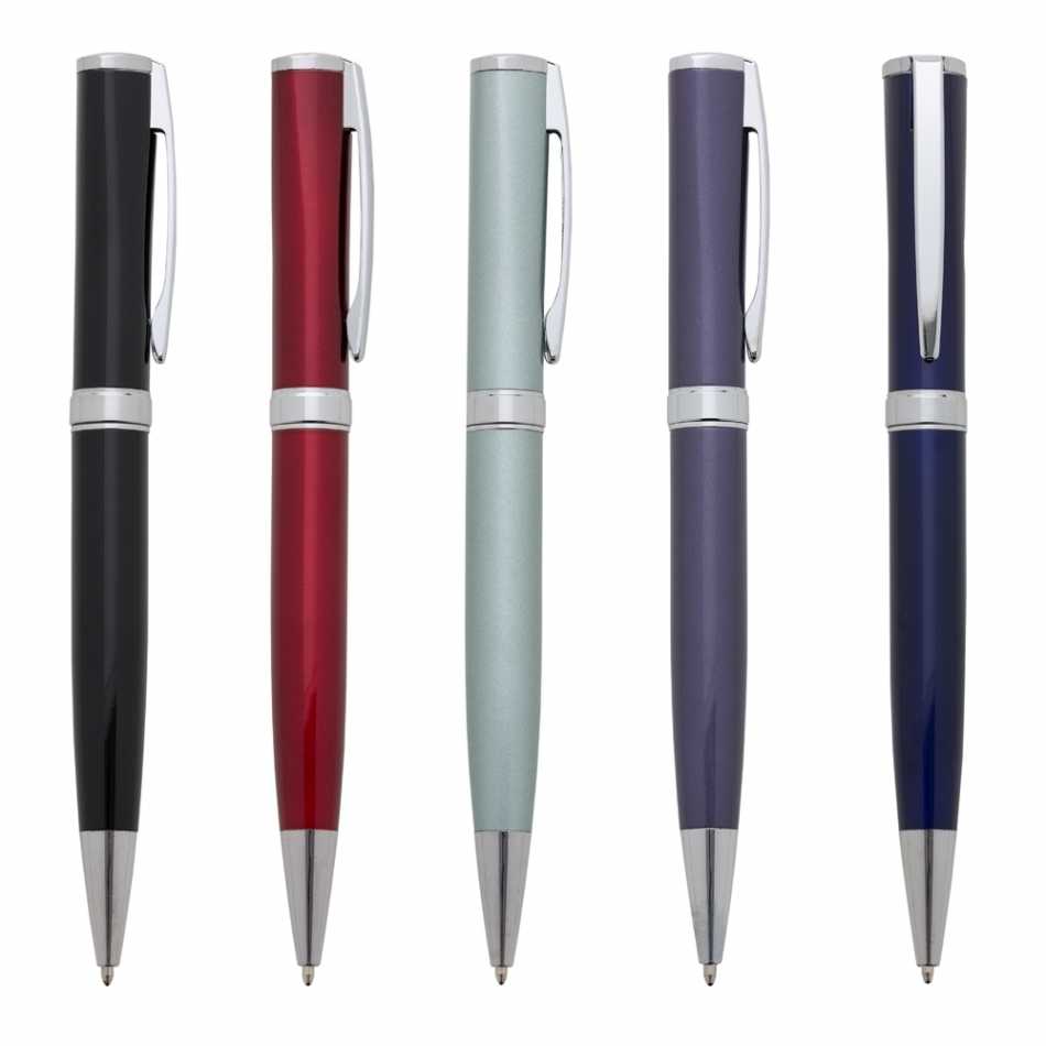 Descrição: Caneta metal inteira colorida(pintura metalizada) com detalhes em prata, design executivo. Anel plástico e clip de metal, aciona por giro.