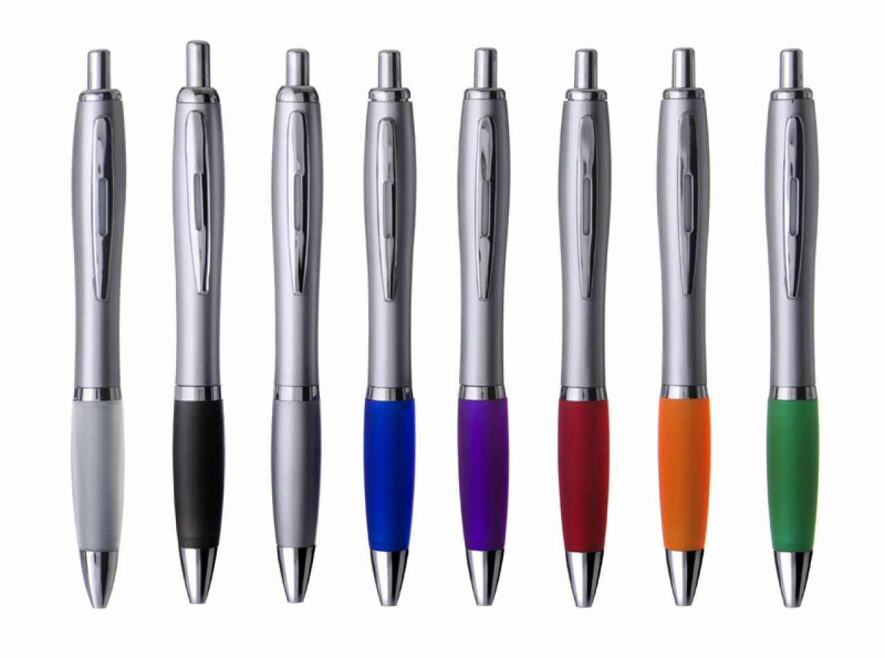 Caneta plástica prata com anel e detalhe emborrachado colorido. Clip de metal, aciona por clique.