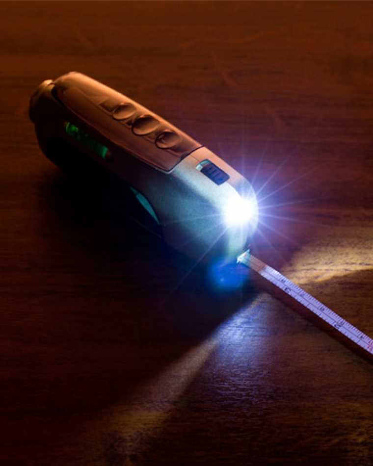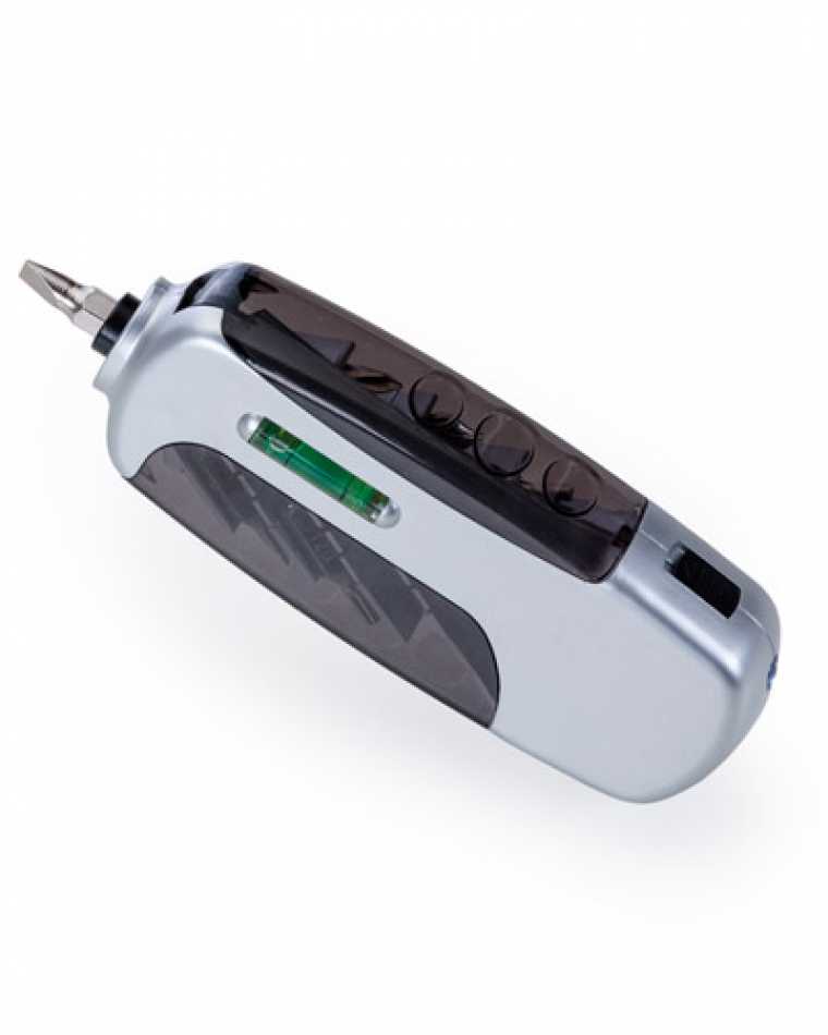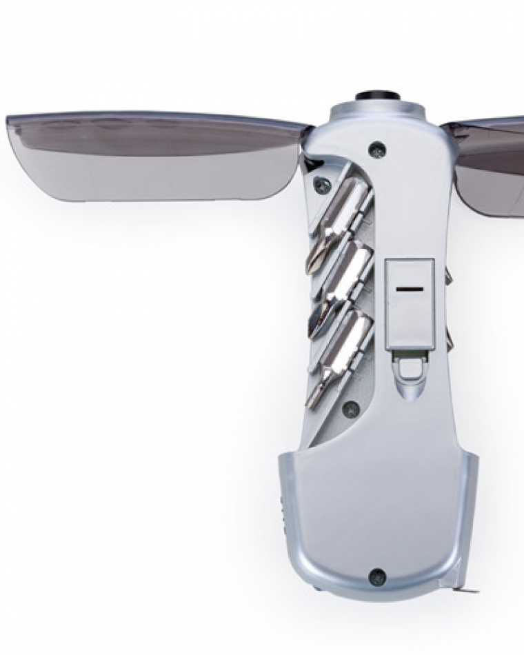 Kit ferramenta multifunções. Corpo prata com detalhes coloridos, abre pelas laterais e possui suporte superior para encaixar as pontas de cada chave. Possui 3 pontas de chaves Philips, 3 pontas de chave de fenda, nível, lanterna com botão para ligar/desligar e trena de 1 metro . Acompanha 3 baterias LR41.