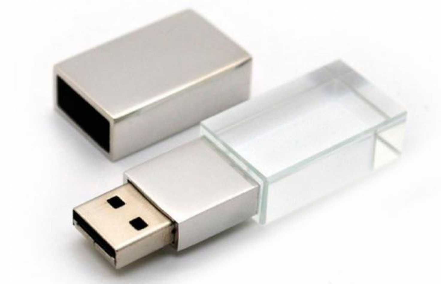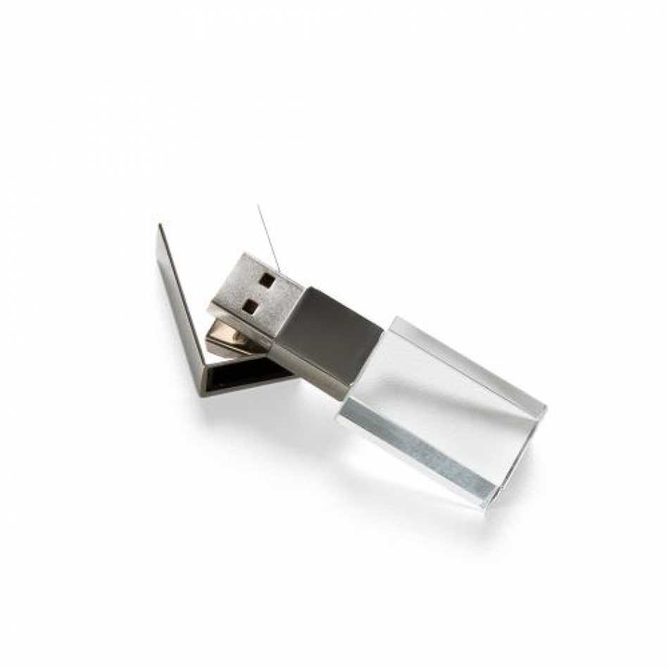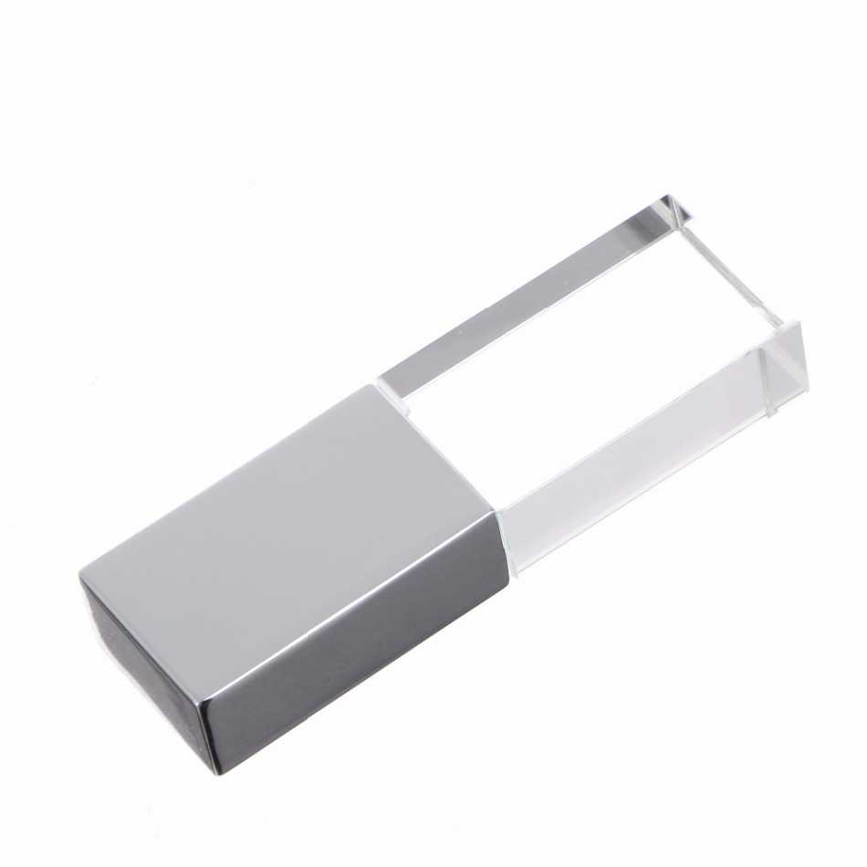 Pen drive 4GB de vidro com tampa plástica prata espelhada.