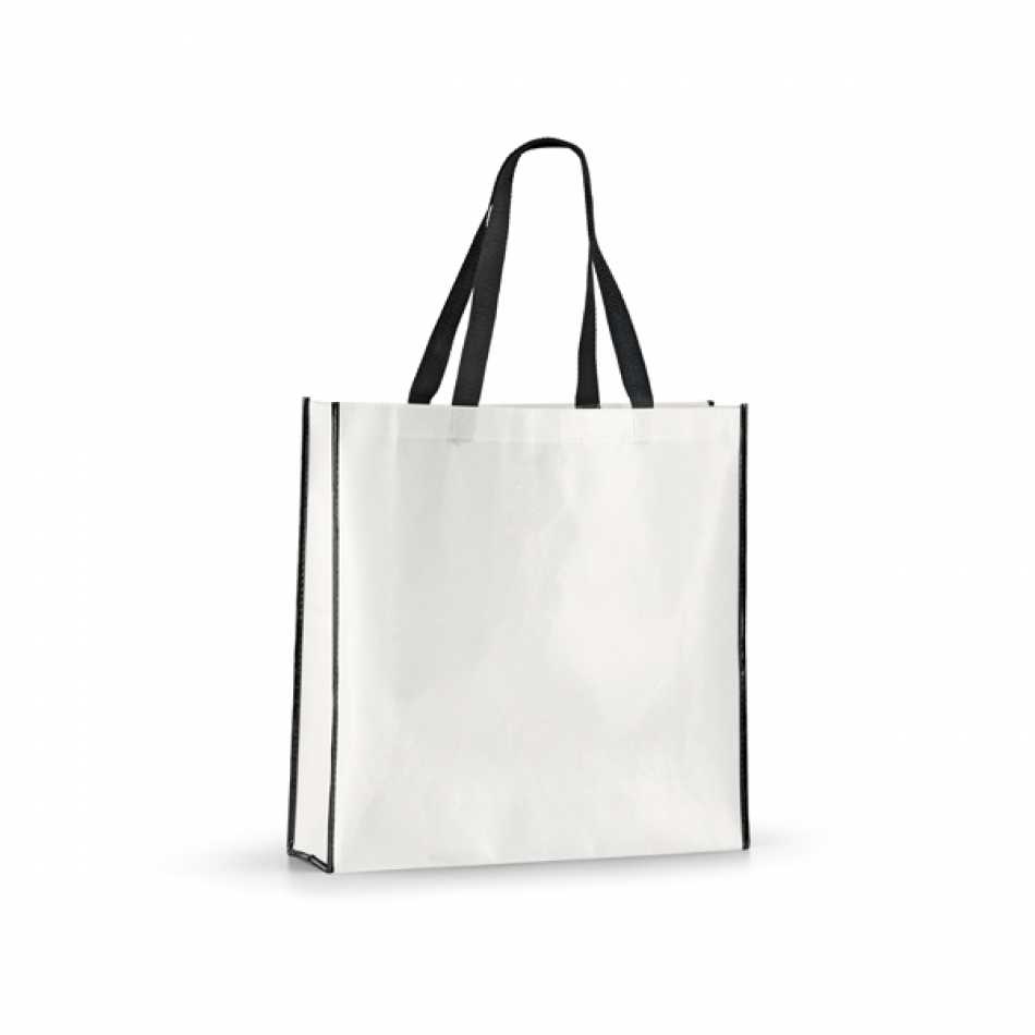 Sacola. Non-woven laminado: 120 g/m². Laminação brilhante. Alças em webbing de 60 cm. 420 x 280 x 150 mm